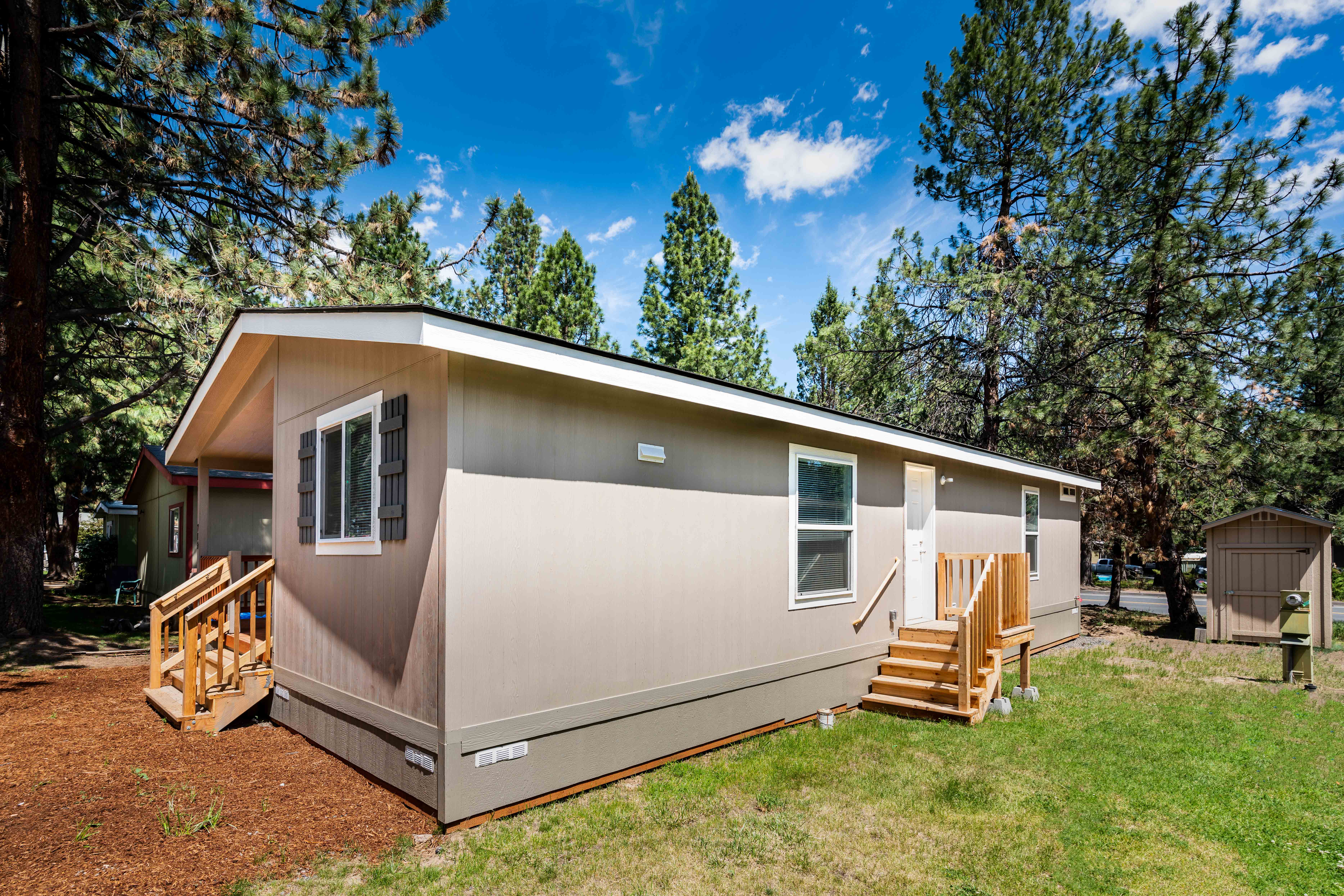 A small beige manufactured home with front steps, a window with shutters, and a storage shed in the backyard, surrounded by trees and grass.