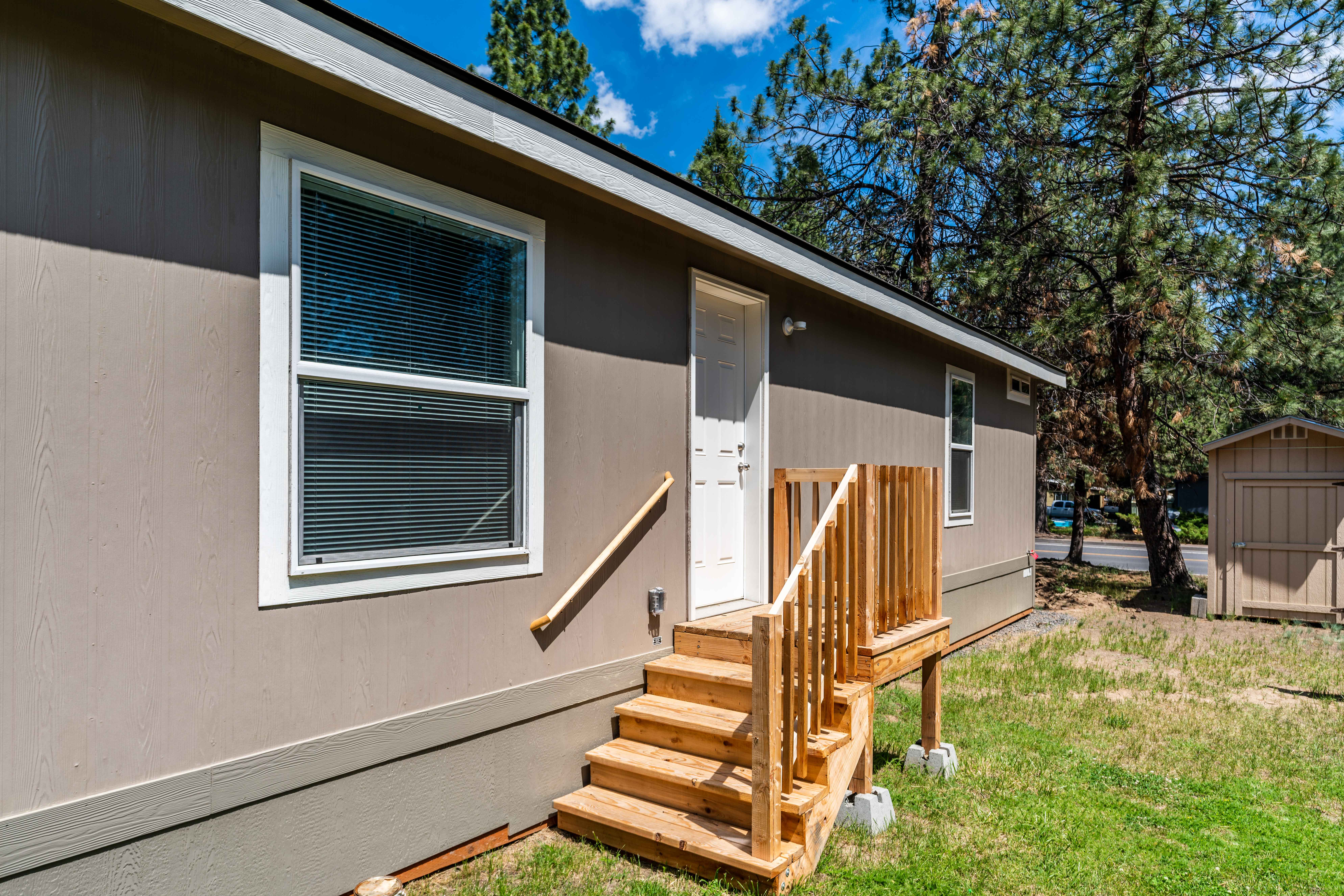 A small beige manufactured home with front steps, a window with shutters, and a storage shed in the backyard, surrounded by trees and grass.